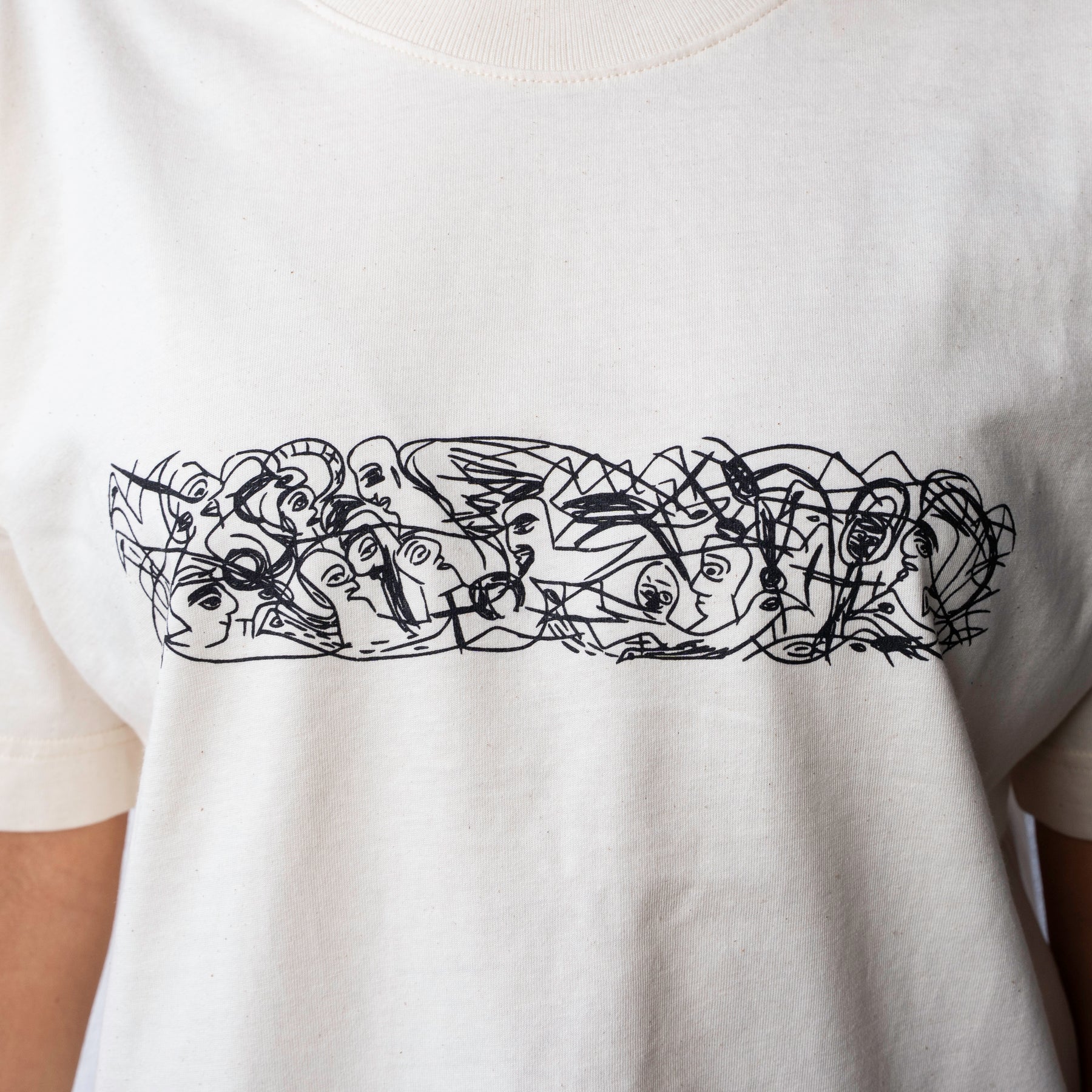 Marškinėliai su Elvyros Kairiūkštytės darbu BE PAVADINIMO (2001). Marškinėlių modelis – oversize. Kiekis itin ribotas.