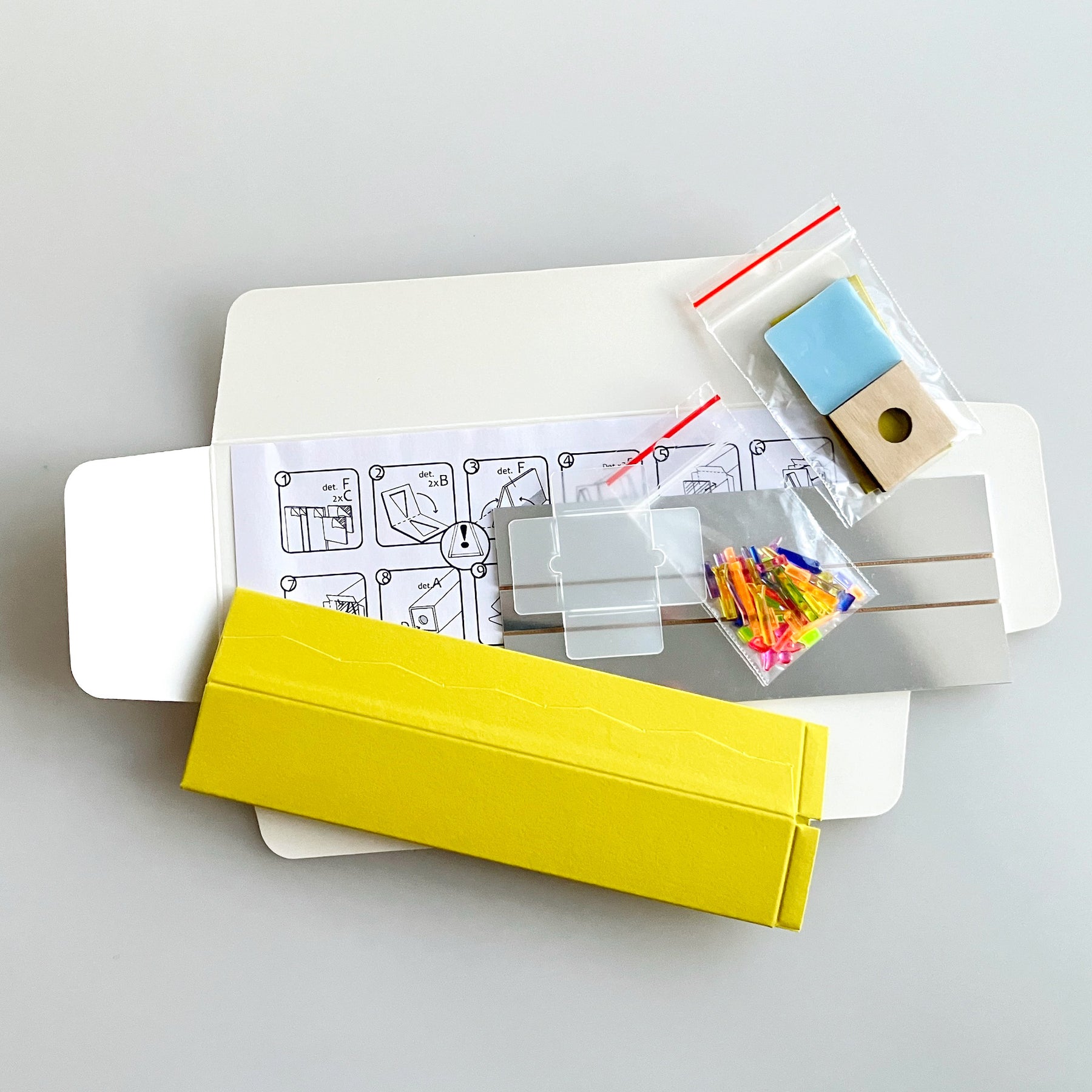 Rinkinį sudaro 8 kaleidoskopui sukonstruoti reikalingos detalės ir instrukcija. Kaleidoskopo korpusas yra iš kartono, galėsi ant jo piešti ir spalvinti, jei tik panorėsi. Pakuotėje rasi: 2 skaidraus plastiko langelius, 3 mažų veidrodėlių optinė sistema ir nuimama matinio plastiko dėžute. Pakuotėje taip pat yra spalvoto plastiko pirminiam standartiniam kaleidoskopo užpildymui.